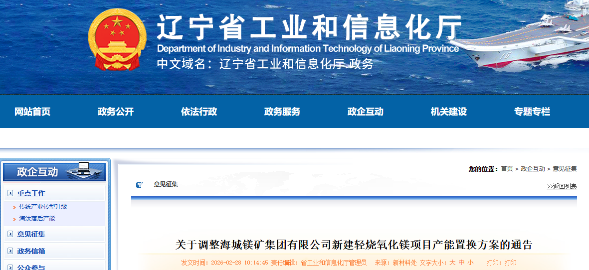 按照《遼寧省人民政府辦公廳關于推進菱鎂行業(yè)高質量發(fā)展的實施意見》(遼政辦發(fā)〔2023〕15號)、《遼寧省菱鎂礦浮選及鎂砂行業(yè)產(chǎn)能置換辦法》(遼工信建材〔2024〕18號)要求,以及菱鎂行業(yè)專項整治工作會商會議安排,根據(jù)企業(yè)調整申請及鞍山市工信局初審,省級復核,我廳于2026年2月9日至2月27日,對海城鎂礦集團有限公司新建輕燒氧化鎂項目產(chǎn)能置換方案進行了公示,公示期間無異議,現(xiàn)予通告。